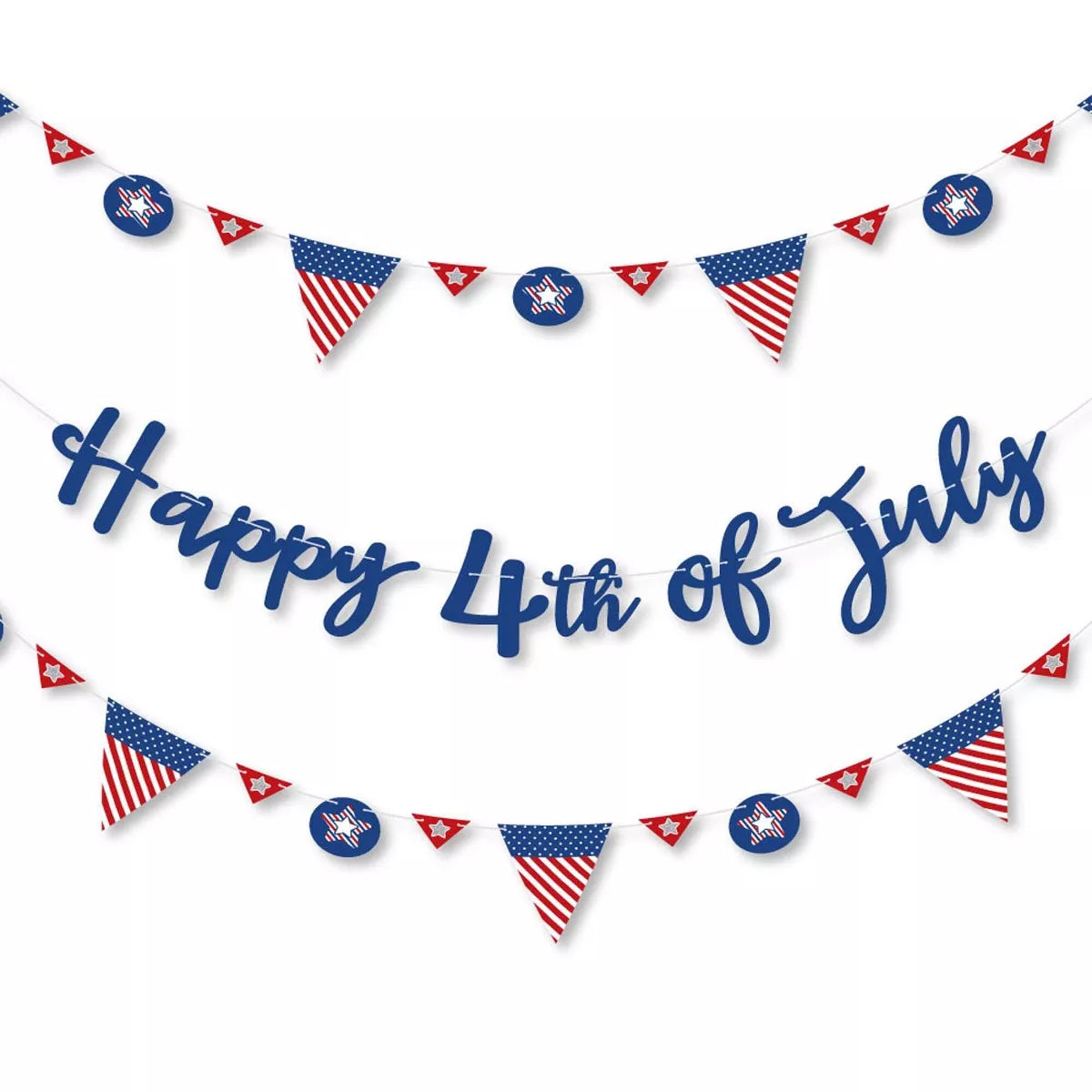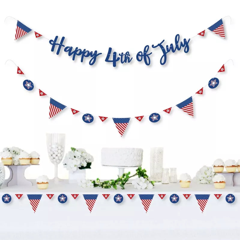 4th of July Letter Banner Decoration INCLUDES Happy 4th of July letters, 36 banner pennant pieces, and cord for hanging. The 4th of July banner looks great at any venue! VARIETY OF DESIGNS & SIZES! Happy 4th of July Letter Banner features coordinating pennant pieces and script letters. Decorate your event with 9 large triangle pennants (6.25" x 7.5"); 9 circle pennants (3.75" x 3.75"); 18 small triangle pennants (3.25" x 2"); and no-mess real glitter Happy 4th of July letters in script style lettering. Easily string them together with the included 10 yards of satin cording.