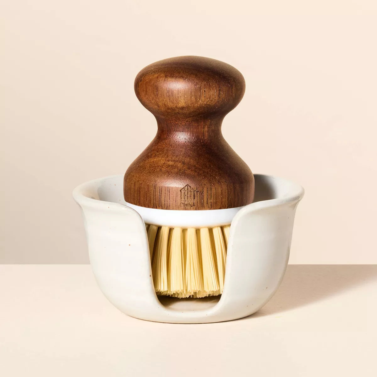 Glazed Stoneware Sink Caddy & Nylon Scrub Brush Cream - Hearth & Hand™